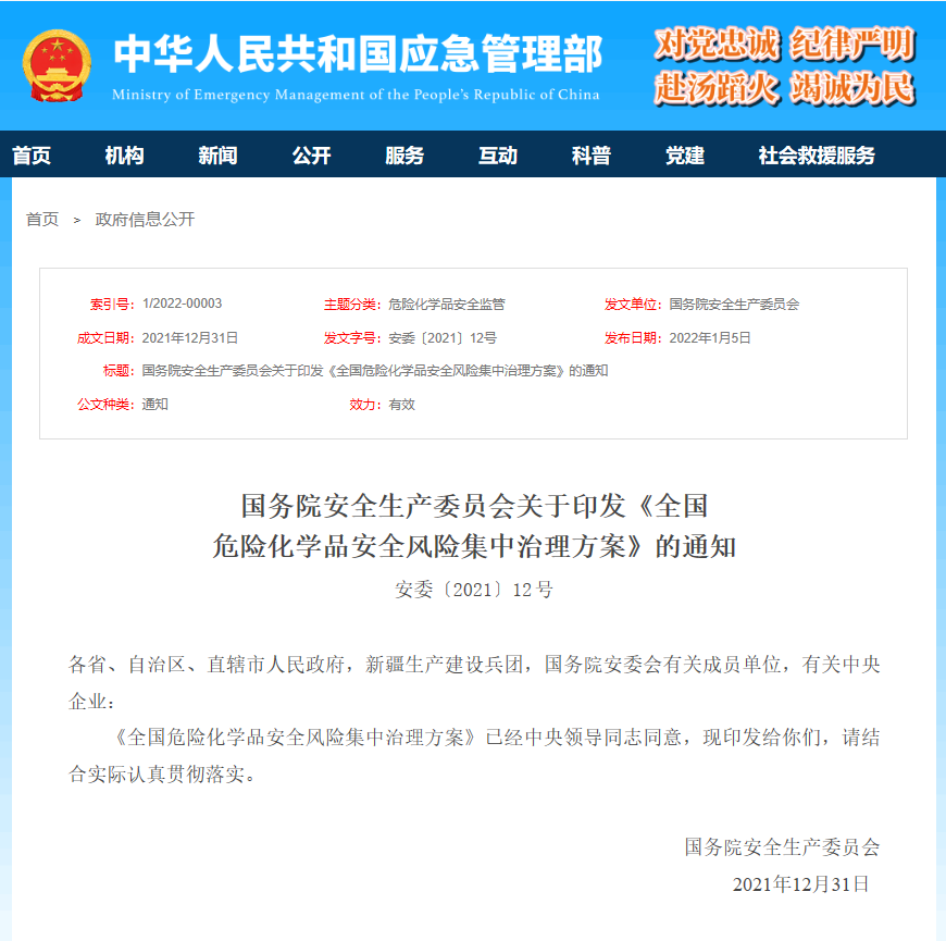2022年1月5日,國務院安全生產(chǎn)委員會發(fā)布關于印發(fā)《全國危險化學品安全風險集中治理方案》的通知(安委〔2021〕12號)。